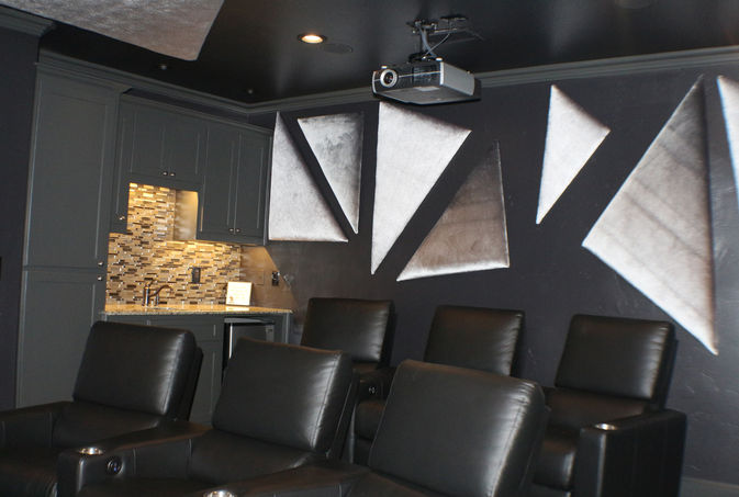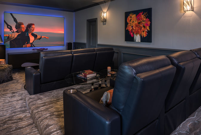 "I enjoy that people are willing to go outside of their comfort zone when it comes to designing home theater rooms. To be bold is celebrated and even a bit expected. Having a bold print for carpet is a great way to ground the space and gives the rest of the room area to be bold as well."